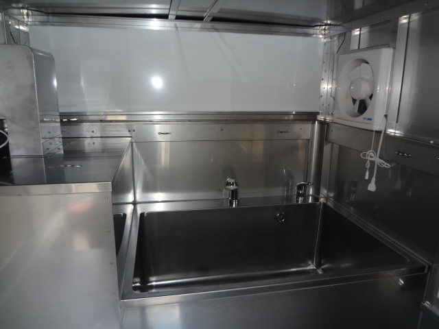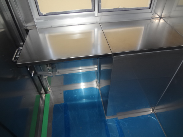 左サイドには換気のための窓、背面には出入口ドアとエアコンを設置しています。