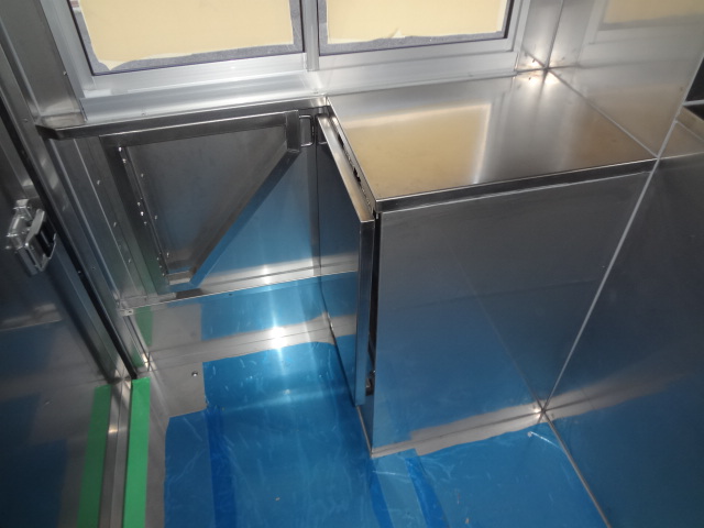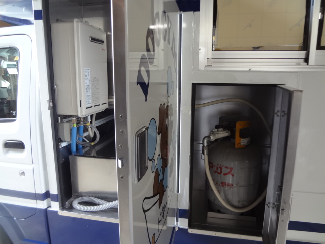 左サイドには給湯室ドアとプロパン室ドア、換気のための窓を設置しました。
